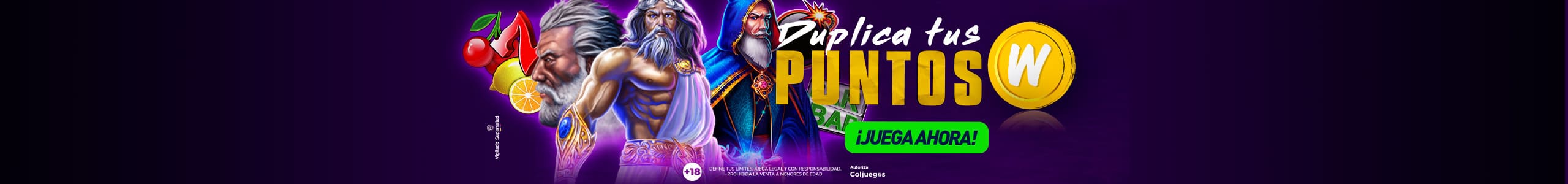 ¿Quieres que tus Puntos W se dupliquen? Entra al Casino W el lunes 3, 10, 17 y 24 de noviembre, durante todo este día, desde las 00:00 hasta las 23:59, podrás ganar el Doble de tus Puntos W aljugar en nuestros tragamonedas especialmente seleccionados: Age of the Gods: God of Storms, Age of the Gods: King of Olympus, Blue Wizard y 20 Hot Blast.